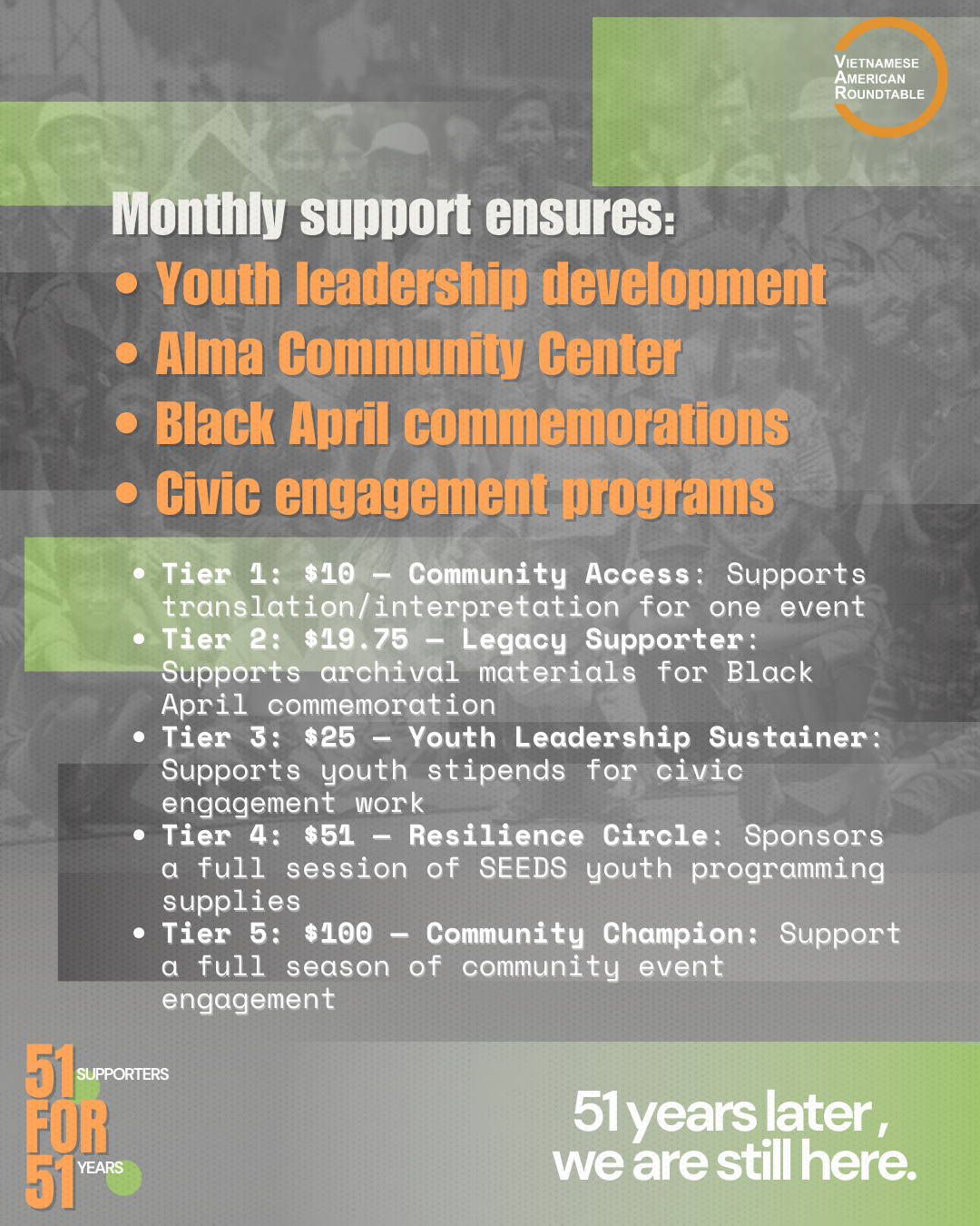 At the Vietnamese American Roundtable, our work is rooted in the belief that our community deserves the resources, leadership, and spaces needed to thrive. From developing youth leaders through SEEDS, to preserving history through Black April commemorations, to building the Alma Community Center as a gathering place for organizing and connection, we are investing in the strength and future of Vietnamese Americans.