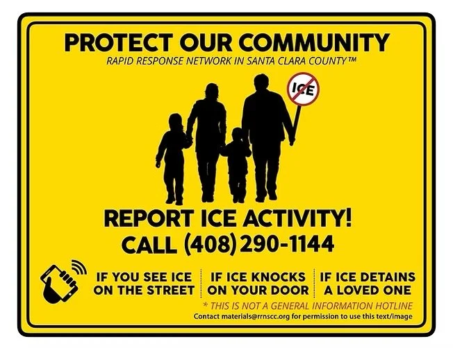 Report ICE Activity: Monitor your local area and immediately notify Rapid Response Networks if you witness enforcement activity. In Santa Clara County, you can reach the 24/7 hotline at (408) 290-1144.